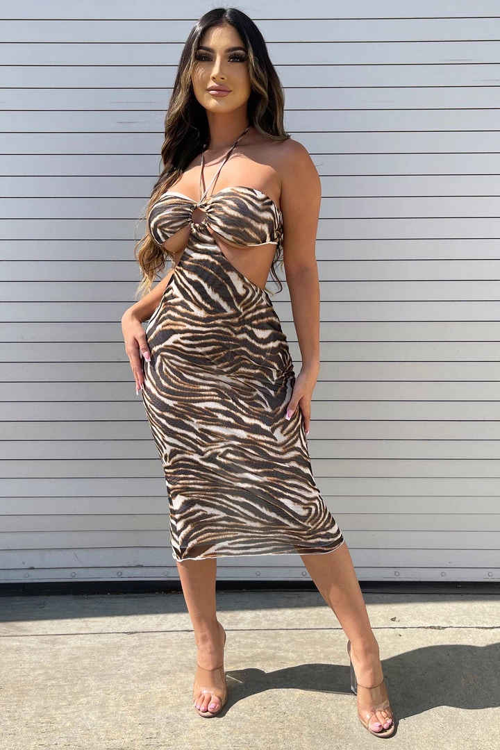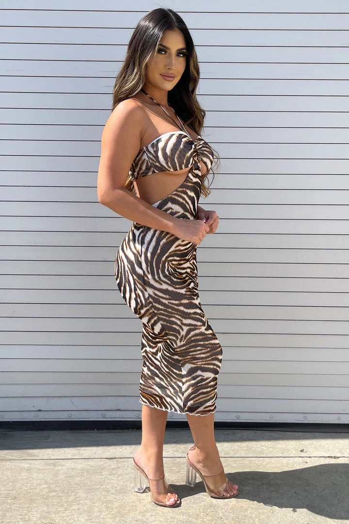 Zebra print midi dress with front halter top.