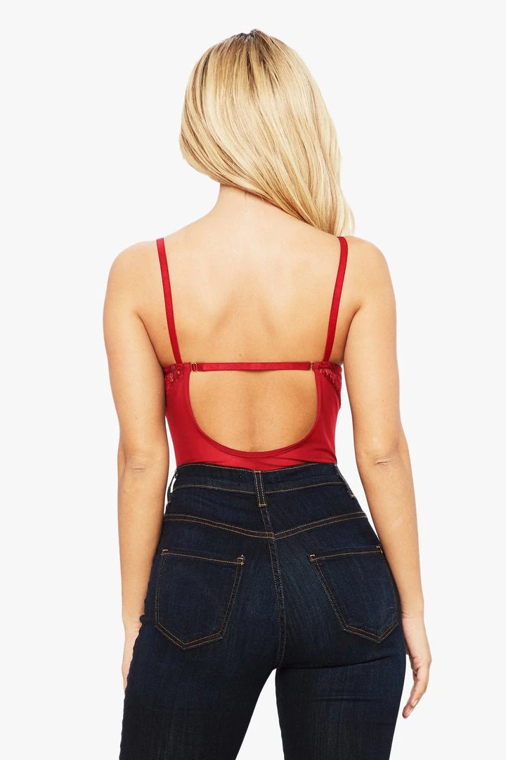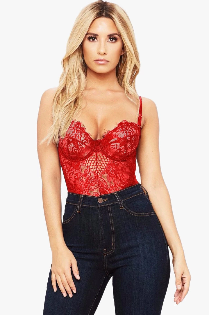 Lace underwire bodysuit with adjustable straps.