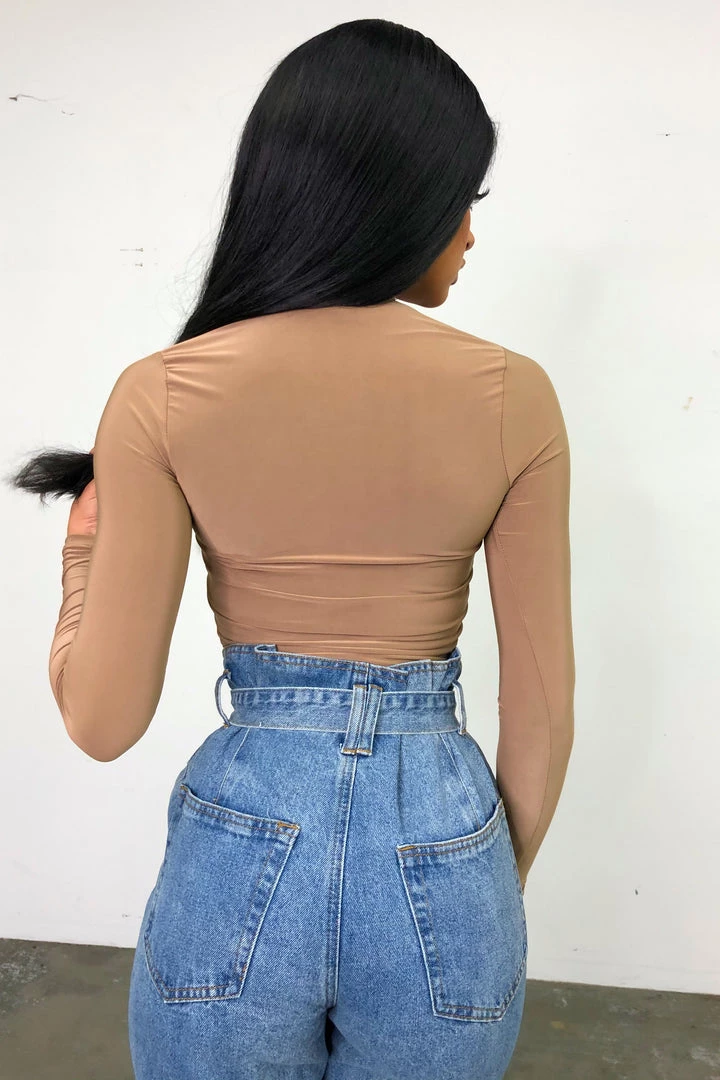 Deep V form fitting bodysuit.