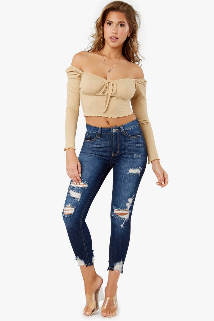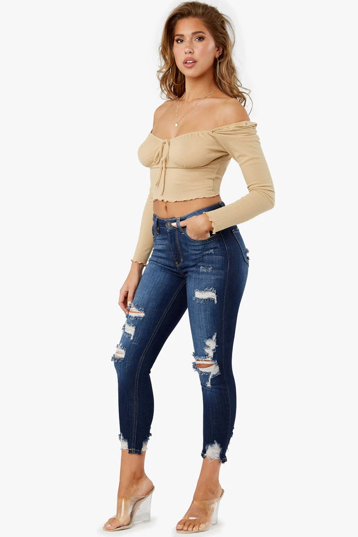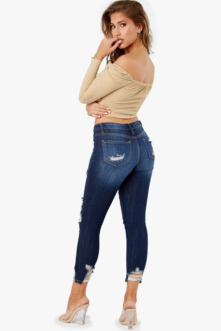 High waisted jeans with distressed cutouts and raw hem details.