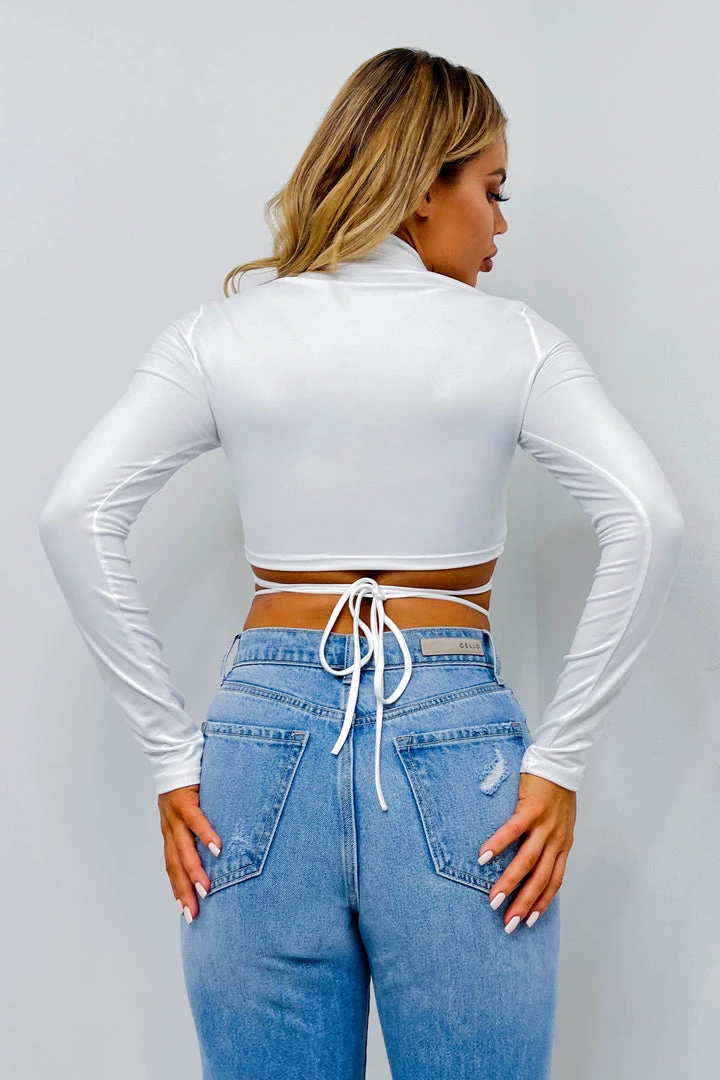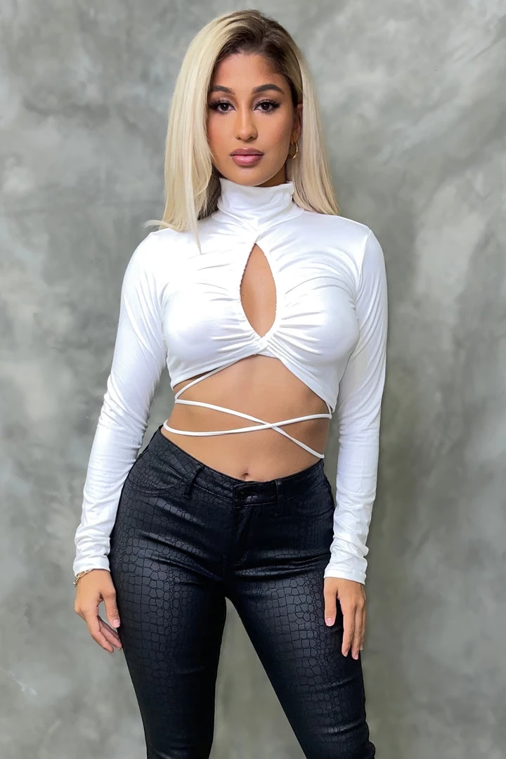 Ruched high neck long sleeve crop top with waist tie.