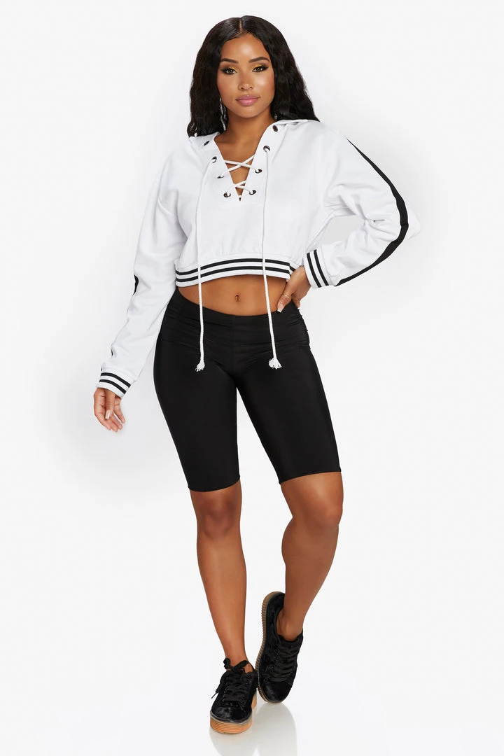 Cropped hoodie featuring front lace up details.