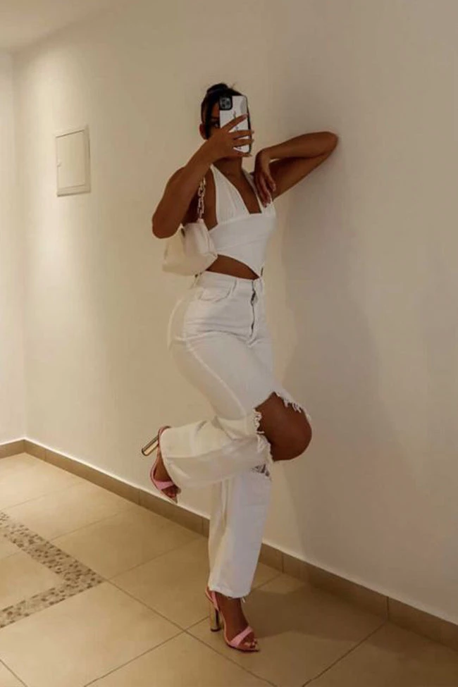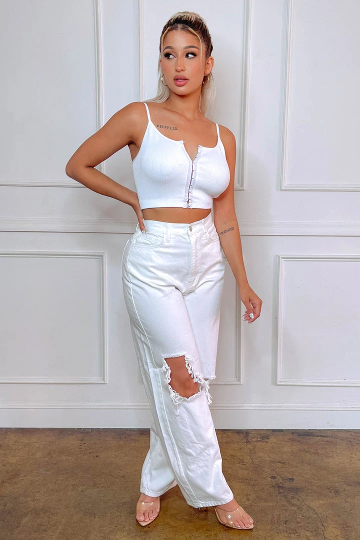 High waisted white denim jeans with wide leg and distressing throughout front.