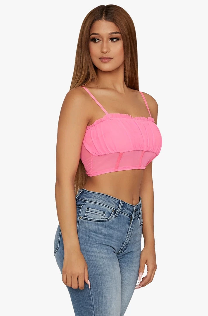 Spaghetti strap crop top featuring ruffle detail along top.