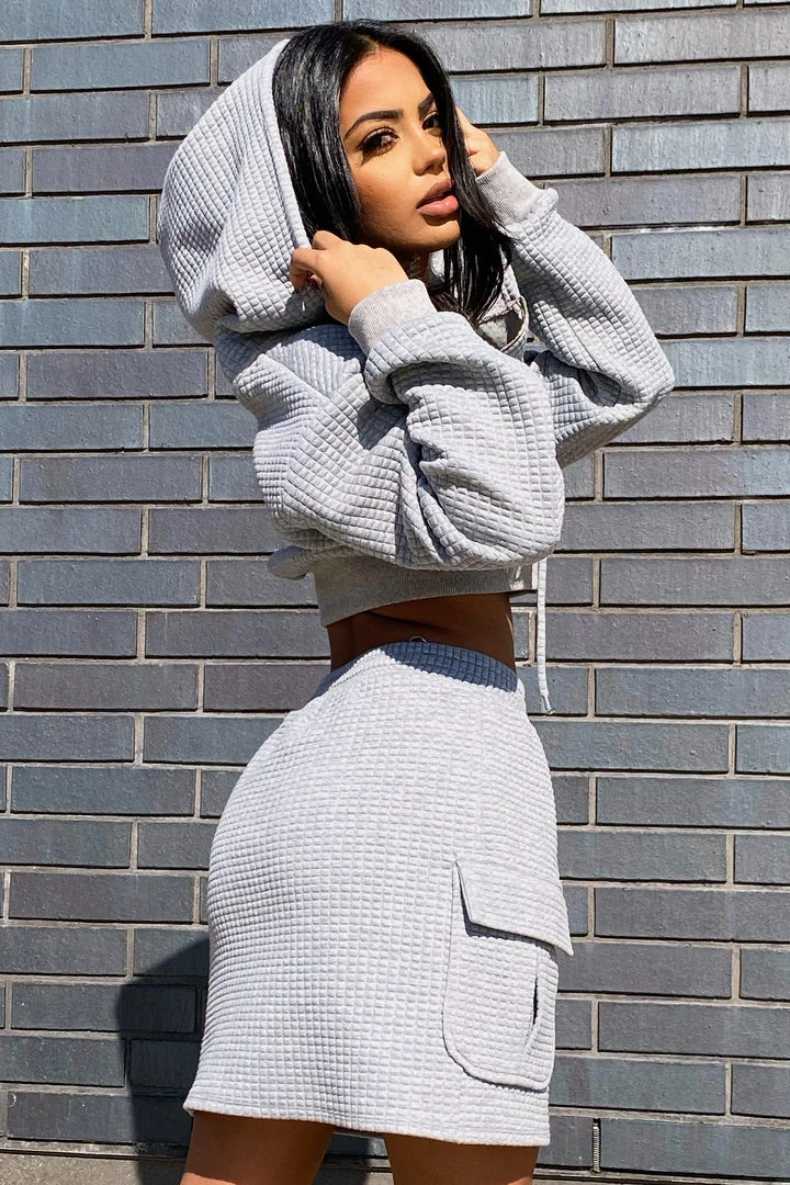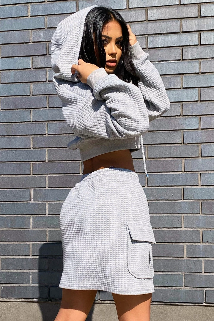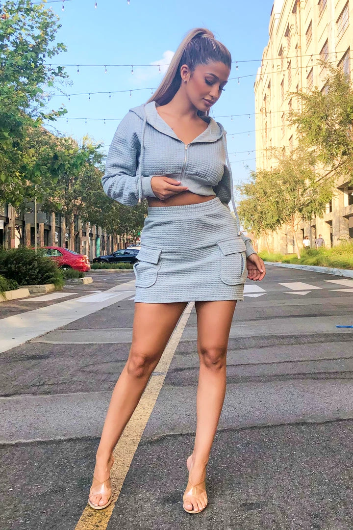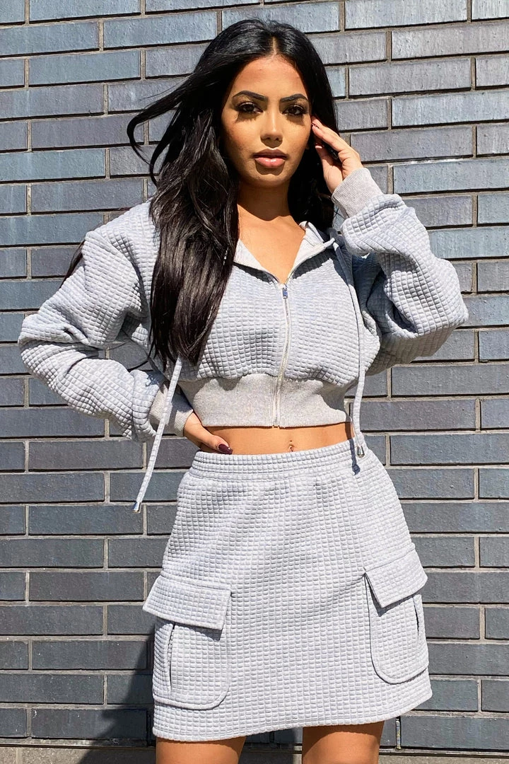 Matching skirt and cropped zip up set featuring a waffle fabric.