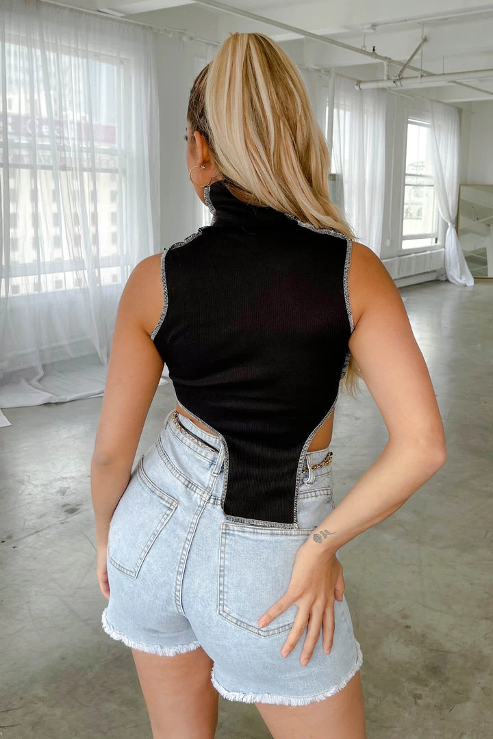 Turtleneck crop tank with exposed stitching.