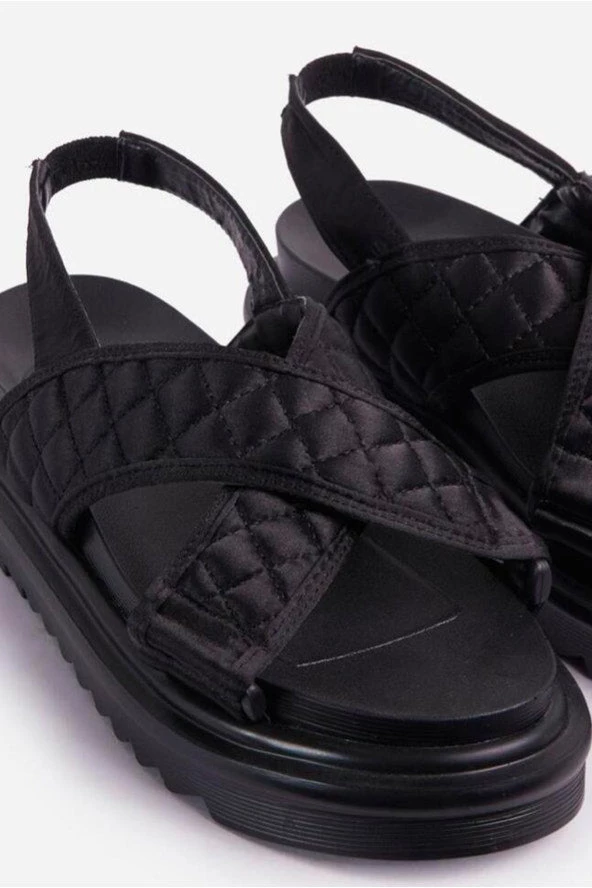 Crossover sandals with elastic backing and quilted texture.