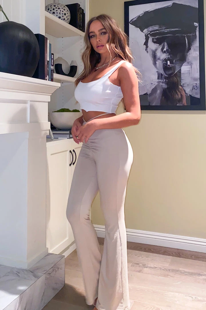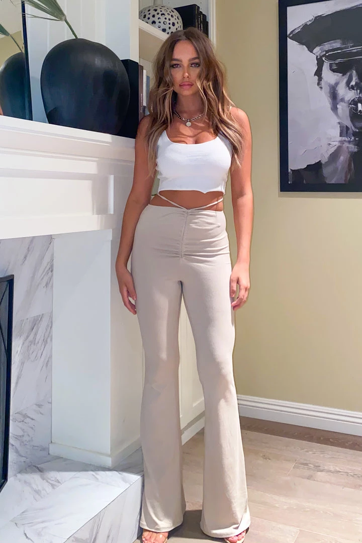 Stretch pants with waist tie and flare bottoms.