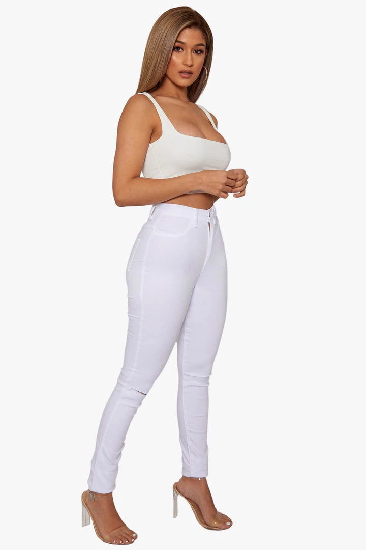 High waisted jeans featuring knee cut outs.