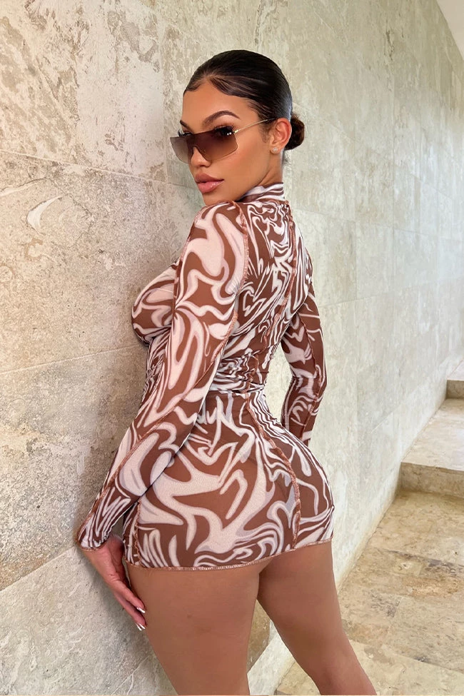 Sheer mock neck mini dress with marble print and contrast stitching.